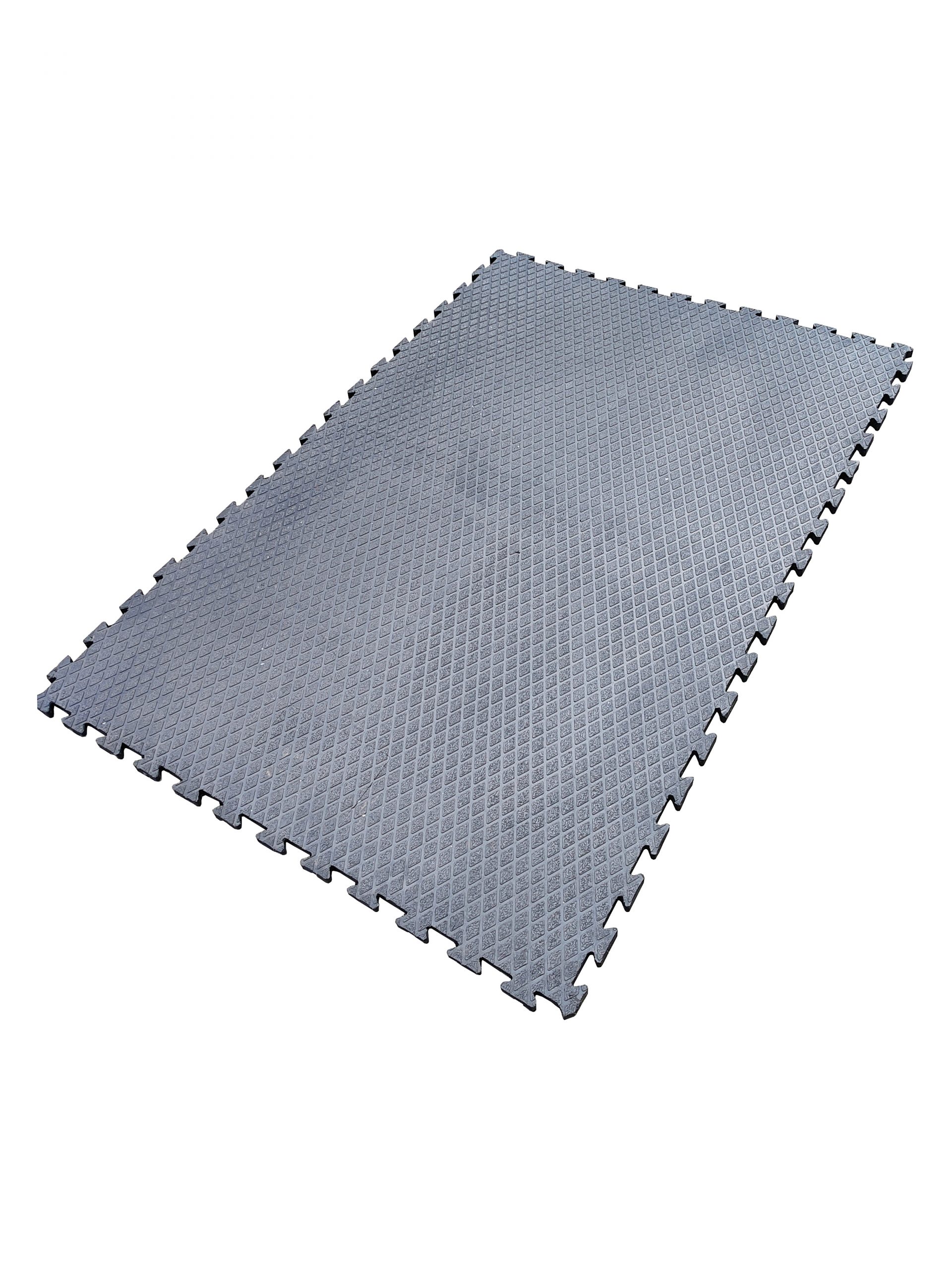 Die spezielle "Diamantenprofil" - Oberflächenstruktur sowie die Elastizität der Gummimatte ermöglicht einen rutschfesten Boden, auch ohne Einstreu. Auch Abschürfungen an den Gelenken beim Aufstehen können so vermieden werden.